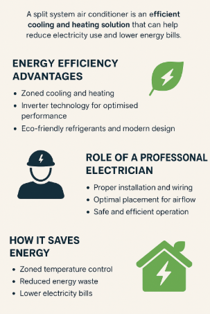 - Why is professional installation important for split system efficiency?A qualified Electrician or Residential Electrician ensures proper wiring, placement, and sealing during installation, which maximises system efficiency and prevents energy loss.